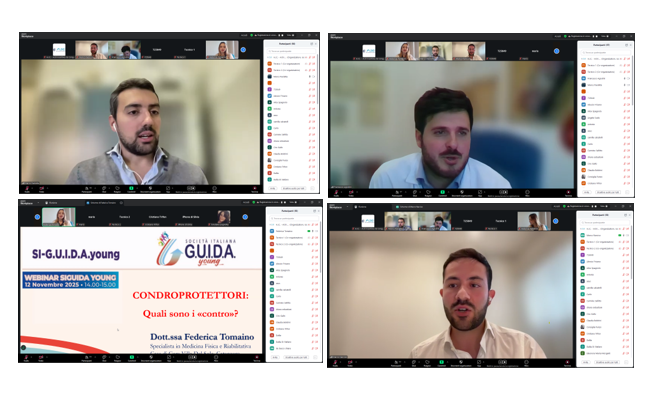 Il 12 novembre si è svolto il webinar della sezione SI-GUIDA young dedicato al tema dell’uso dei condroprotettori, un argomento di grande interesse e spesso oggetto di dibattito nella pratica clinica. L’incontro, organizzato dalla segreteria scientifica e coordinato da Marco Paoletta e Francesco Agostini, ha avuto l’obiettivo di chiarire miti e verità sull’impiego di queste sostanze, analizzandone vantaggi e limiti alla luce delle evidenze scientifiche disponibili.